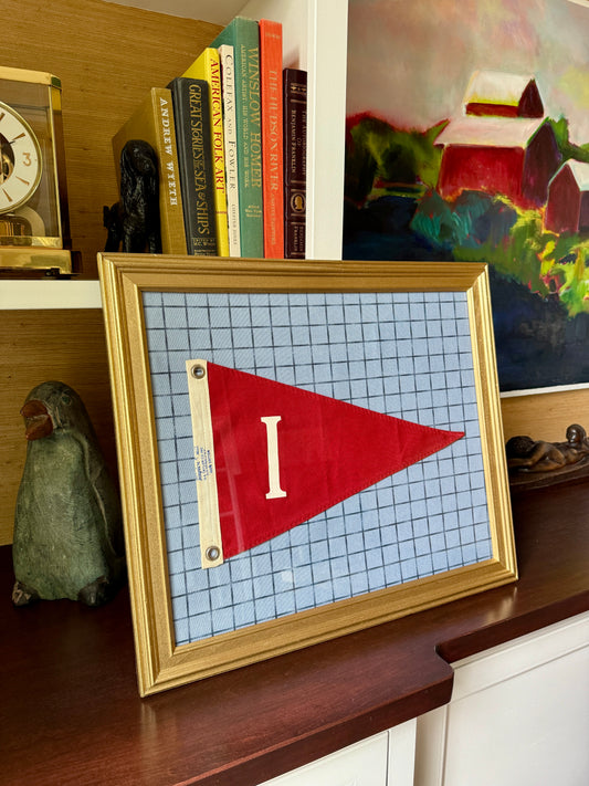 Vintage "I" Burgee Nautical Flag on Blue Windowpane Fabric in Gold Frame