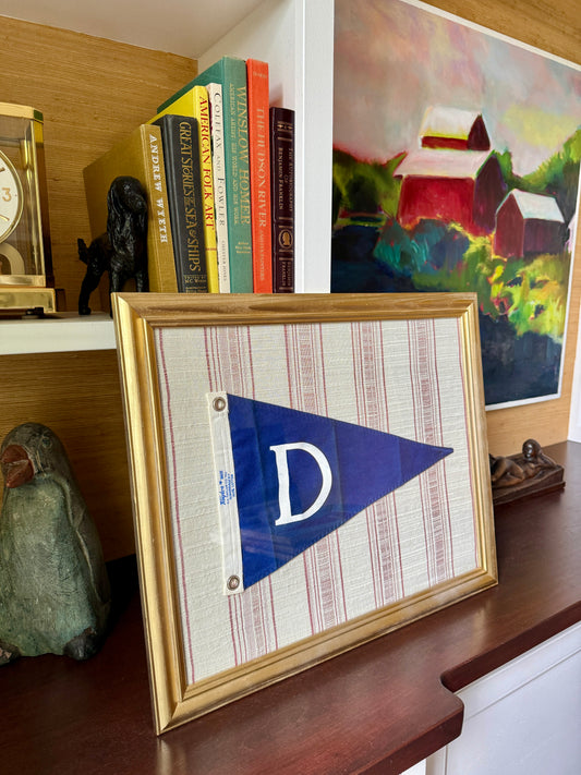 Vintage "D" Burgee Nautical Flag on Red and Ivory Striped Linen in Gold Frame
