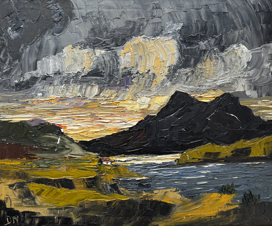Moody Impasto Stormy Coastal Scottish Loch Mountain Landscape Oil Painting in Gold Frame