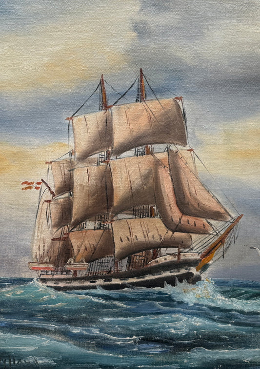 Early 20th Century Clipper Ship Seascape Portrait Oil Painting in Gold Frame