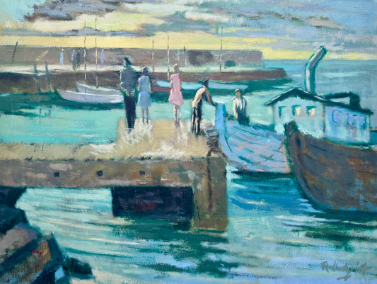 Mid Century Girls at the Harbor Boats at Sunset Oil Painting in Gold Frame