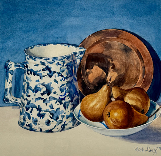 Vintage Still Life Blue White Splatterware Pitcher with Pears Watercolor Painting in Gold Frame
