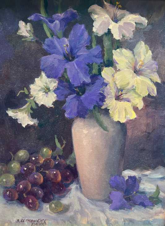 Sandra Leinonen Dunn Still Life of Irises and Fruit Contemporary Oil Painting in Gold Frame