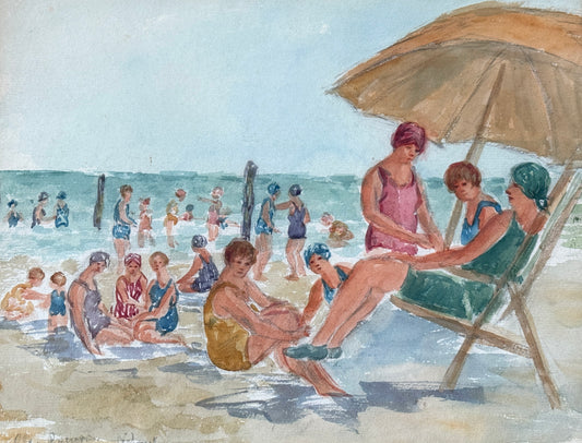 Olga Lea Rosenson Early 20th Century Watercolor Swimmers Beach Scene in Gold Frame