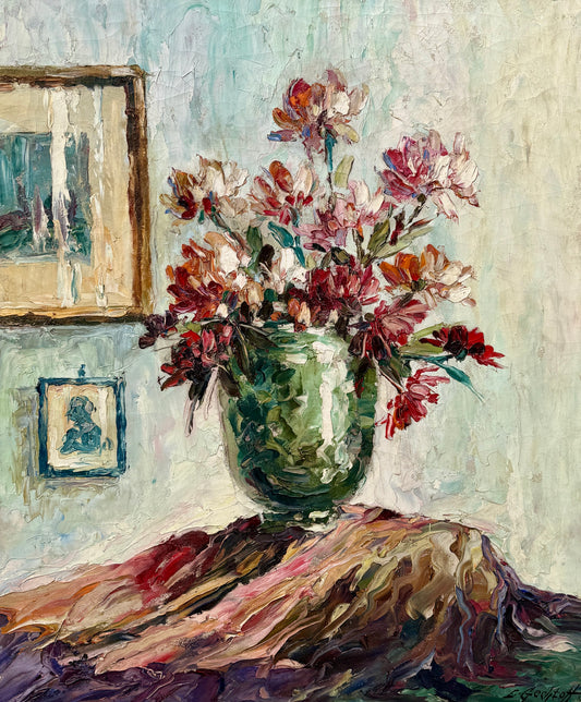 Leonid Gechtoff Still Life of Flowers in Vase with Art Impasto Oil Painting in Gold Frame