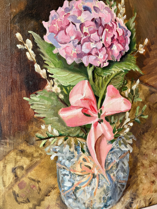 Josephine Paddock Easter Plant Hydrangea Pussy Willow with Bow Still Life Oil Painting in Ornate Gold Frame