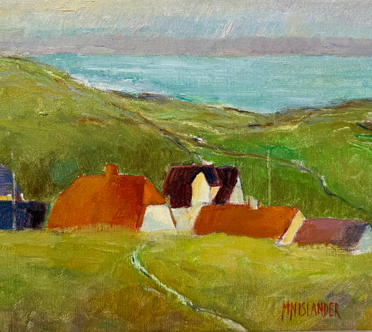 Modernist Vintage Hillside Landscape with Houses Oil Painting in Gold Frame