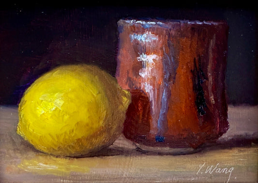 Lemon and Copper Mug Still Life Oil Painting in Gold Frame