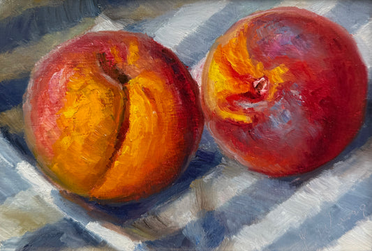 Peaches in Blue and White Towel #2 Still Life Oil Painting in Gold Frame