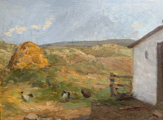 Impressionist Blue Skied Farm Landscape with Chickens Oil Painting in Gold Frame