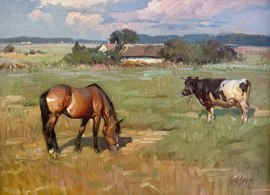 Knud Erik Edsberg 1954 and Cow in Meadow Landscape Oil Painting in Gold Frame