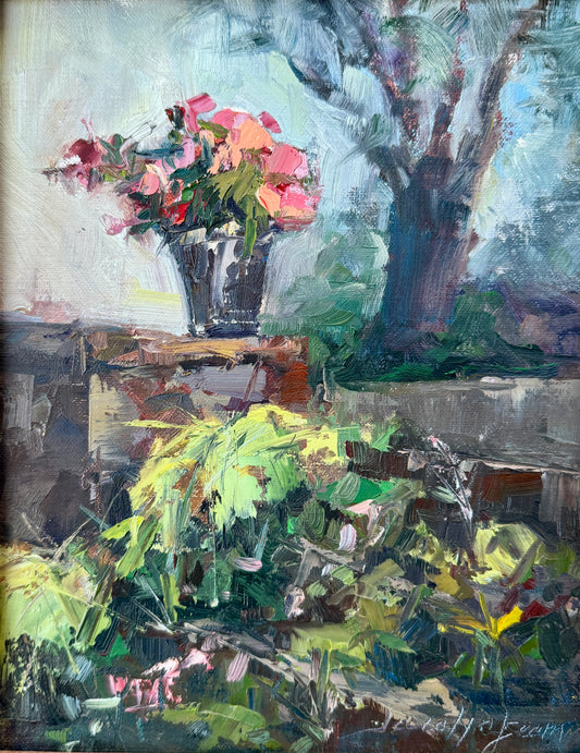 Jacyln Beam Flower Garden Oil Painting in Moss Green and Gold Frame