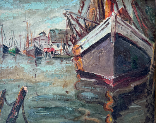 Manner of Emile Albert Gruppe New England Dockside Scene #1 Oil Painting in Gold Frame