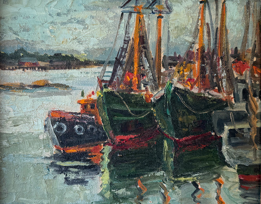 Ron Chouinard Family of Boats in Rockport Harbor MA Oil Painting in Gold Frame