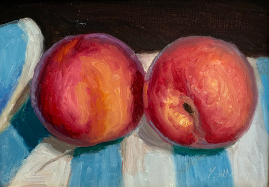 Peaches in Blue and White Towel Still Life Oil Painting in Gold Frame