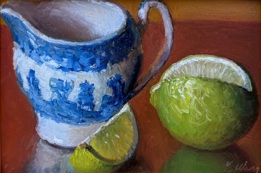 Lime and Blue and White China Dish Still Life Oil Painting in Gold Frame