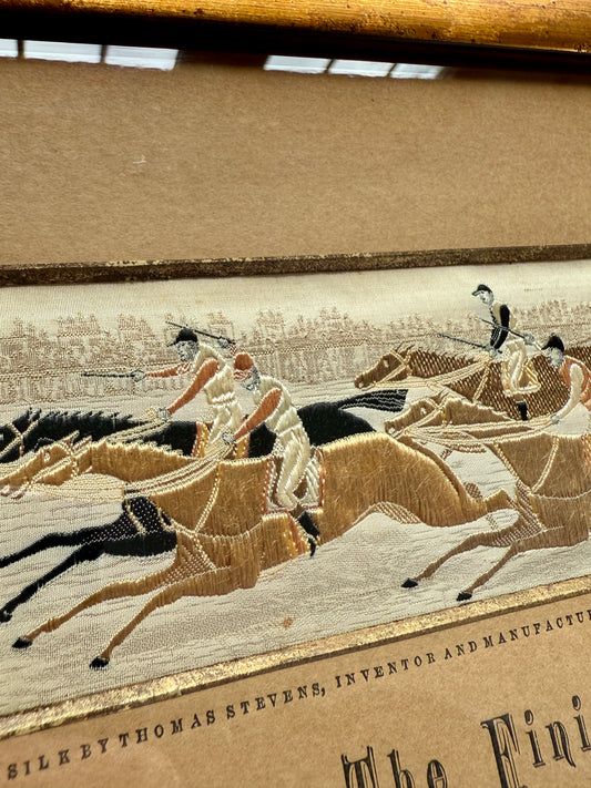 Pair of 19th Century Thomas Stevens Silk Embroidered Horse and Jockey Racing Scenes