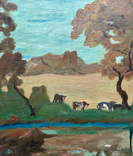 George Glenn Newell Antique Impressionist Cows in Landscape Oil Painting in Gold Frame