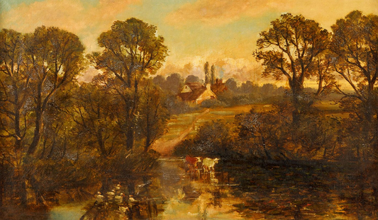 19th Century Pastoral Country Landscape with Cows Oil Painting in Ornate Gold Frame