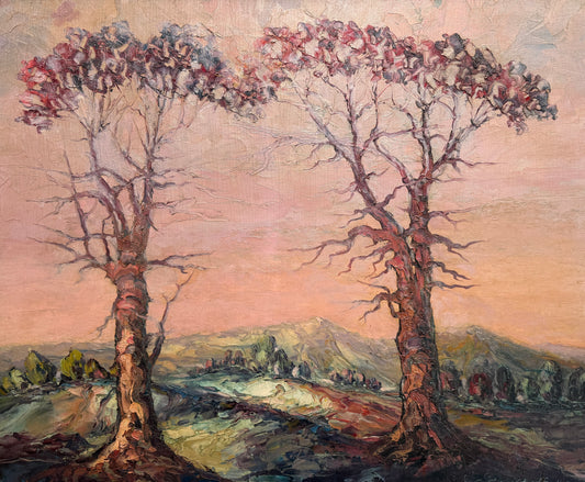 1969 Vintage Abstract Blue Pink Greenland Landscape Oil Painting on Canvas in Gold Frame