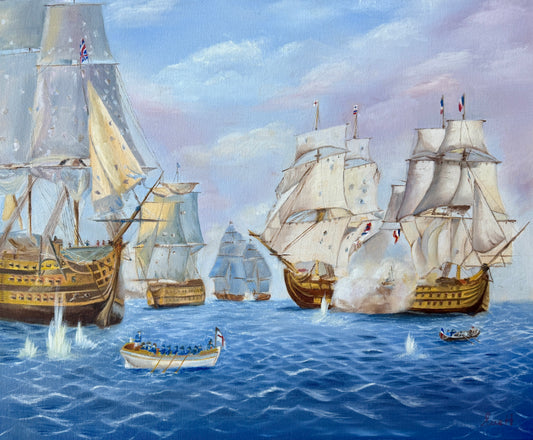 Vintage Naval Battle of Trafalgar Ships in Seascape Oil Painting in Wood Frame