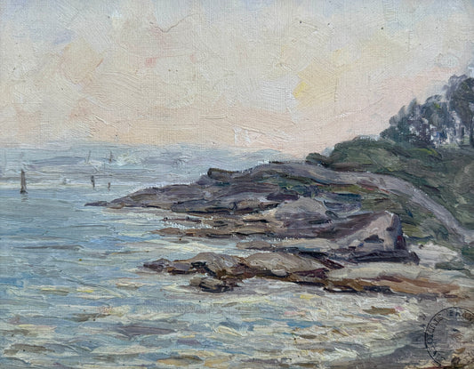 Franklin White Coastal Landscape with Sailboats Oil Painting in Gold Frame