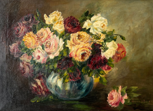 Vintage Roses in Blue Vase Floral Still Life Oil Painting on Canvas in Gold Frame
