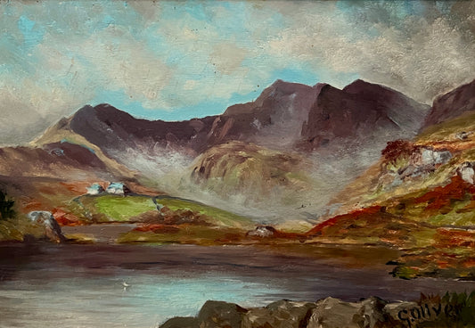 Vintage Mountain Lake Landscape Oil Painting in Gold Frame