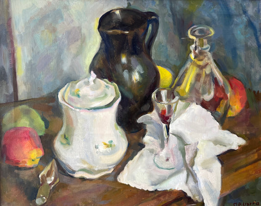 Marian D. Harris Still Life Apples Pears Wine Decanter Oil Painting in Gold Frame