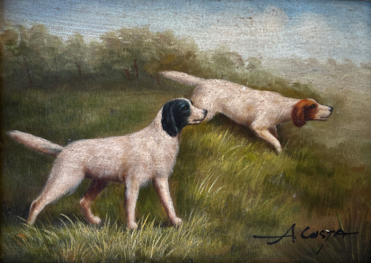 Early 20th Century Pointer Hunting Dogs Portrait Oil on Board Painting in Gold Frame