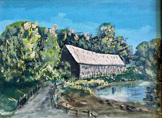 Vintage Spring in New England Covered Bridge Landscape Oil Painting in Gold Frame