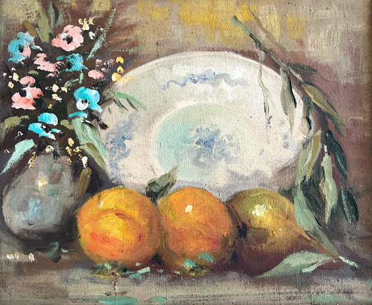 Vintage Still life Blue White Plate, Pear and Oranges Oil Painting in Gilded Wood Frame