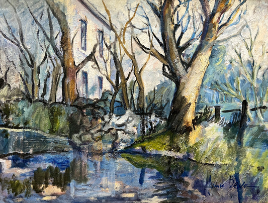 June Bevan "Blue Water" Landscape Oil Painting in Gold Frame