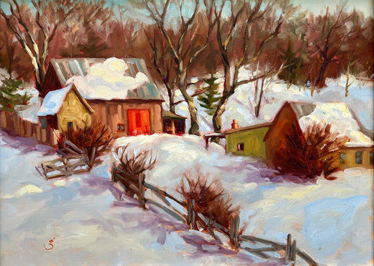 Geoff Bladon Colorful American Winter Farm Landscape Oil Painting in Gold Frame