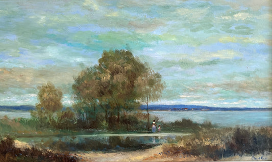 James G. Llewelyn Mother Daughter Waterfront Landscape Oil Painting in Gilded Carved Frame