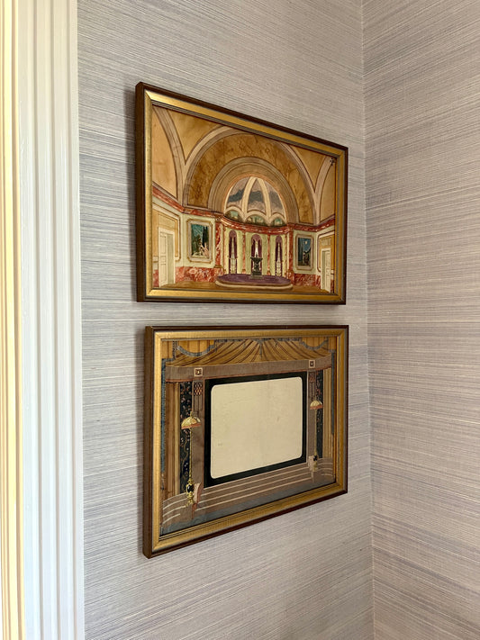 Pair of Two Antique Early 20th Century Interior Theater Set Gouache Paintings in Gold Frames