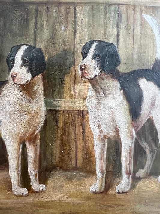 Early 20th Century English Pointer Hunting Dogs Portrait Oil on Board Painting in Gold Frame