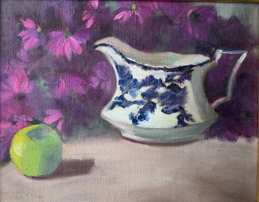 Still Life Painting of Blue White Pitcher, Purple Flowers and Green Apple in Gold Frame