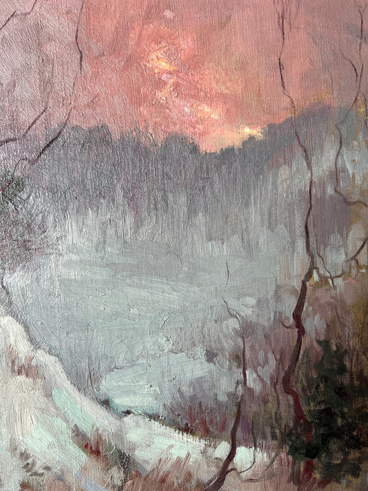 Pink Winter Sunset Oil on Board Painting in Carved Frame