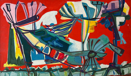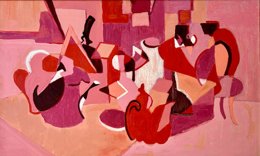 Pink and Red Retro Abstract Tabletop Tea Party Still Life Oil Painting in Gold Frame