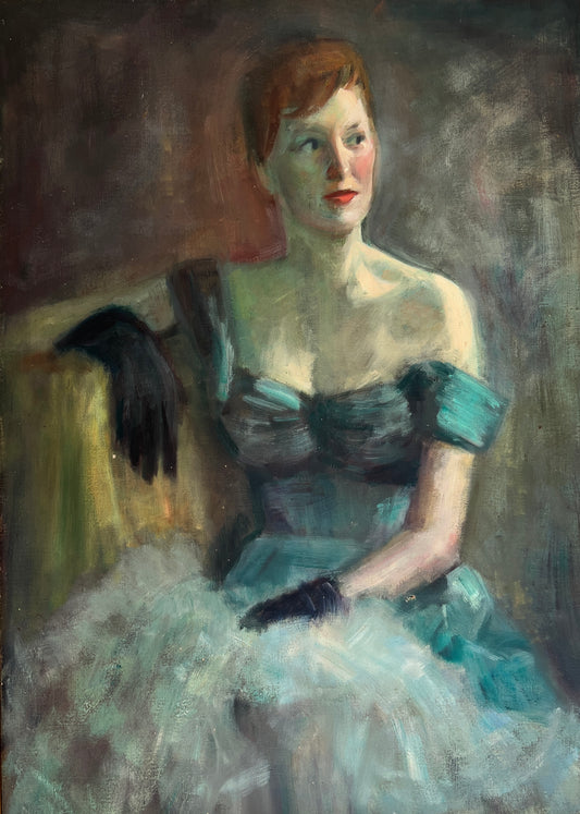 Mid Century Red Headed Lady in Evening Gown Portrait Oil Painting in Gold Frame