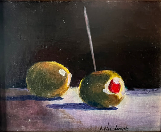 Small Scale Green Olive Still Life Oil Painting on Board in Gold Frame