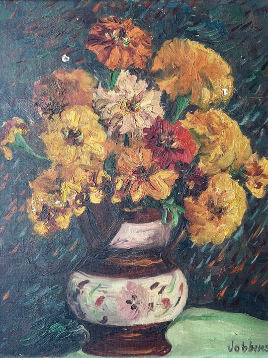 Vintage Caroline Jobbins Warm Floral Still Life in Wood Frame