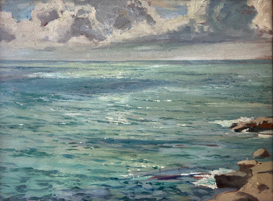 Antique Early 20th Century Waterfront Landscape Oil Painting in Carved Wood Frame