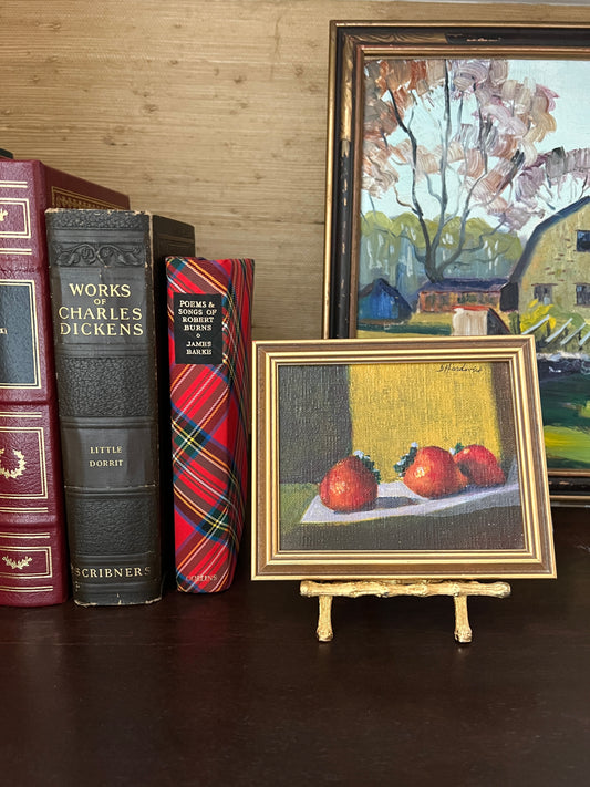 Small Scale Strawberry Still Life Oil Painting on Board in Gold Frame