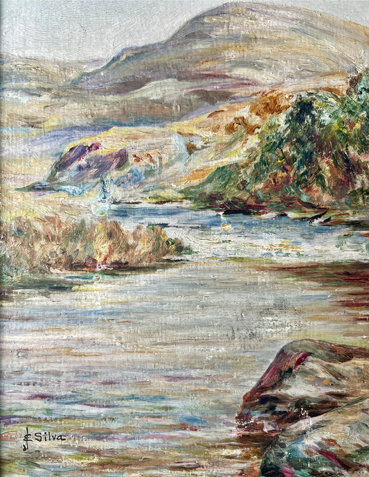J.E. Silva Early 20th Century Landscape Oil Painting in Carved Art Deco Gold Frame