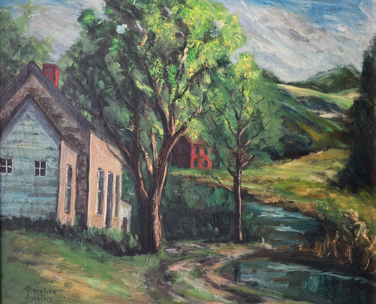 Vintage Caroline Jobbins American Country Landscape Oil Painting in Gold Frame