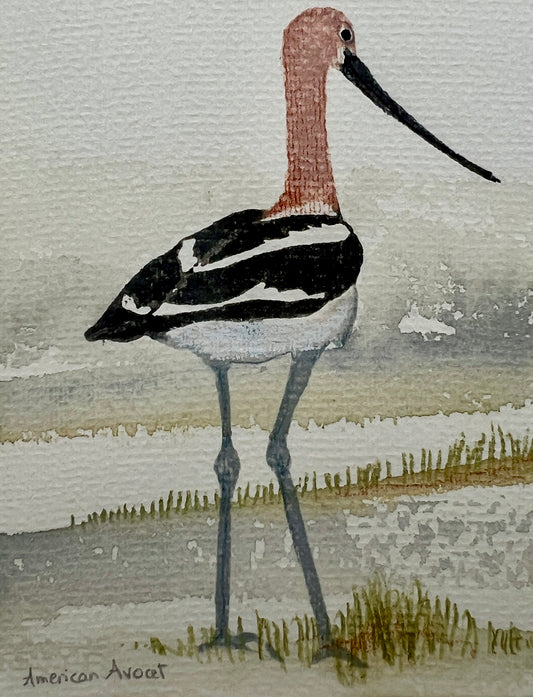 Polly French American Avocet Shore Bird Watercolor in White Wood Frame