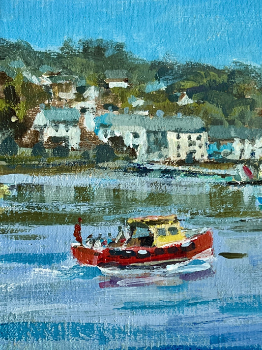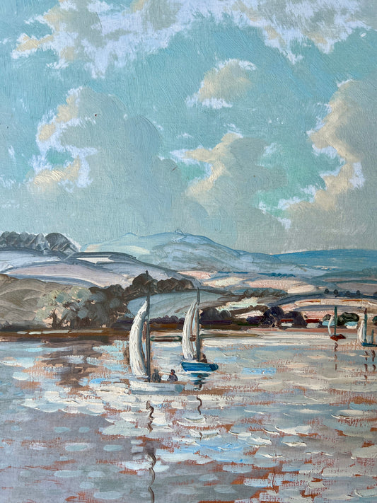 John Edwards (British, b. 1914) "Cornish Sailing Club" Coastal Landscape with Sailboats in Yellow Frame