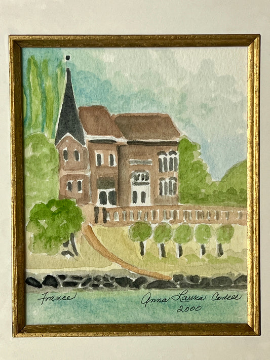 Contemporary French Chateau in the Countryside Watercolor Painting in Gold Frame